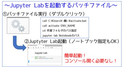 Jupyter Labを起動するときに、いちいちコンソールを開いて、jupyter labと打つのがめんどくさい!という方のために、Jupyter Labを起動するバッチファイルの作成方法を紹介します。少し応用すると、ノートブックを指定して起動するバッチファイルも作成可能…