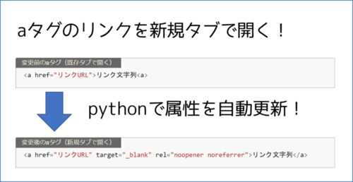 "htmlのaタグのリンクを外部リンクで開くようにaタグを更新するpythonスクリプトを紹介します。 テキスト形式でhtmlを用意して、pythonスクリプトを実行すると自動でaタグの属性を更新してくれます。"